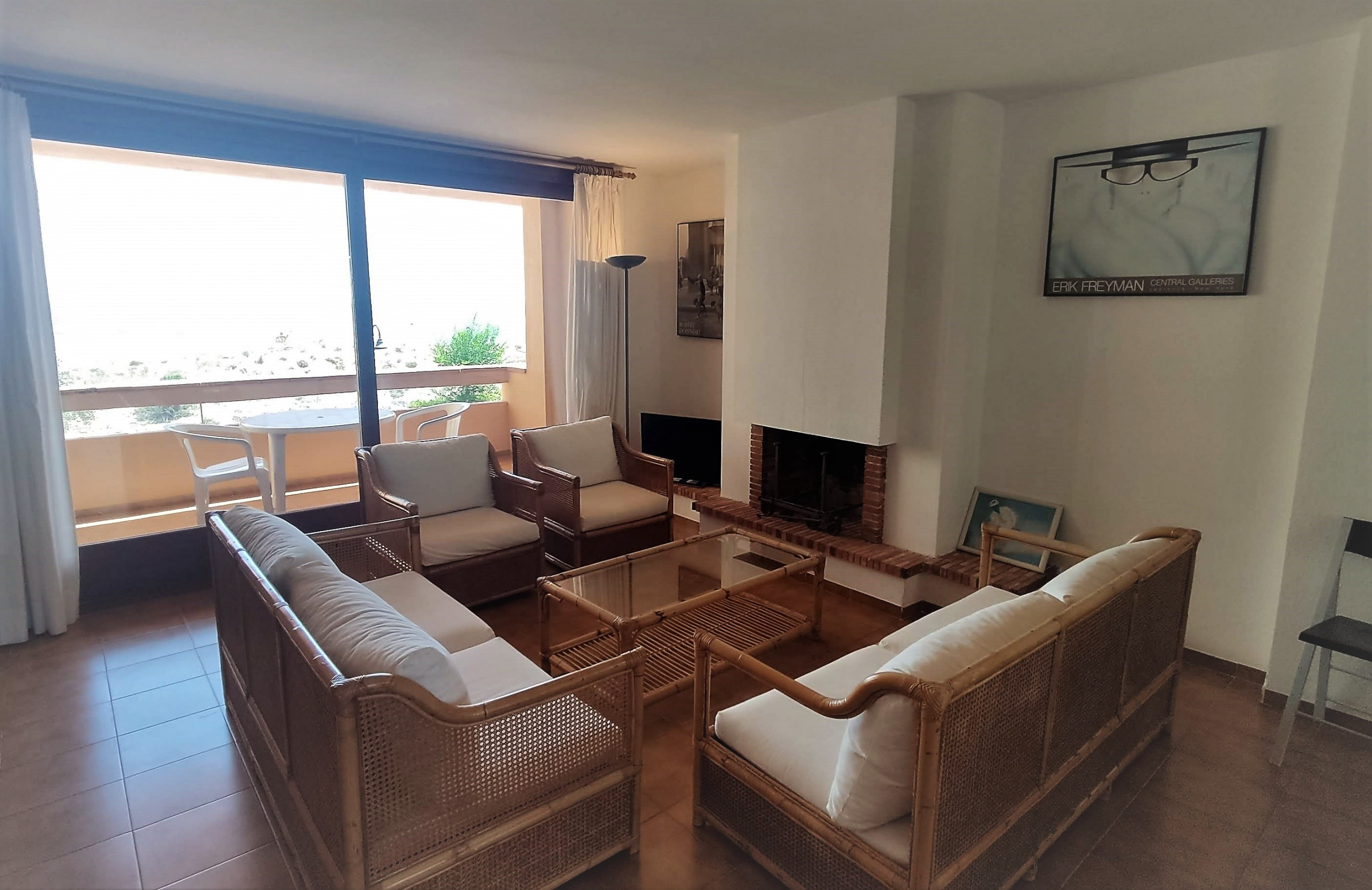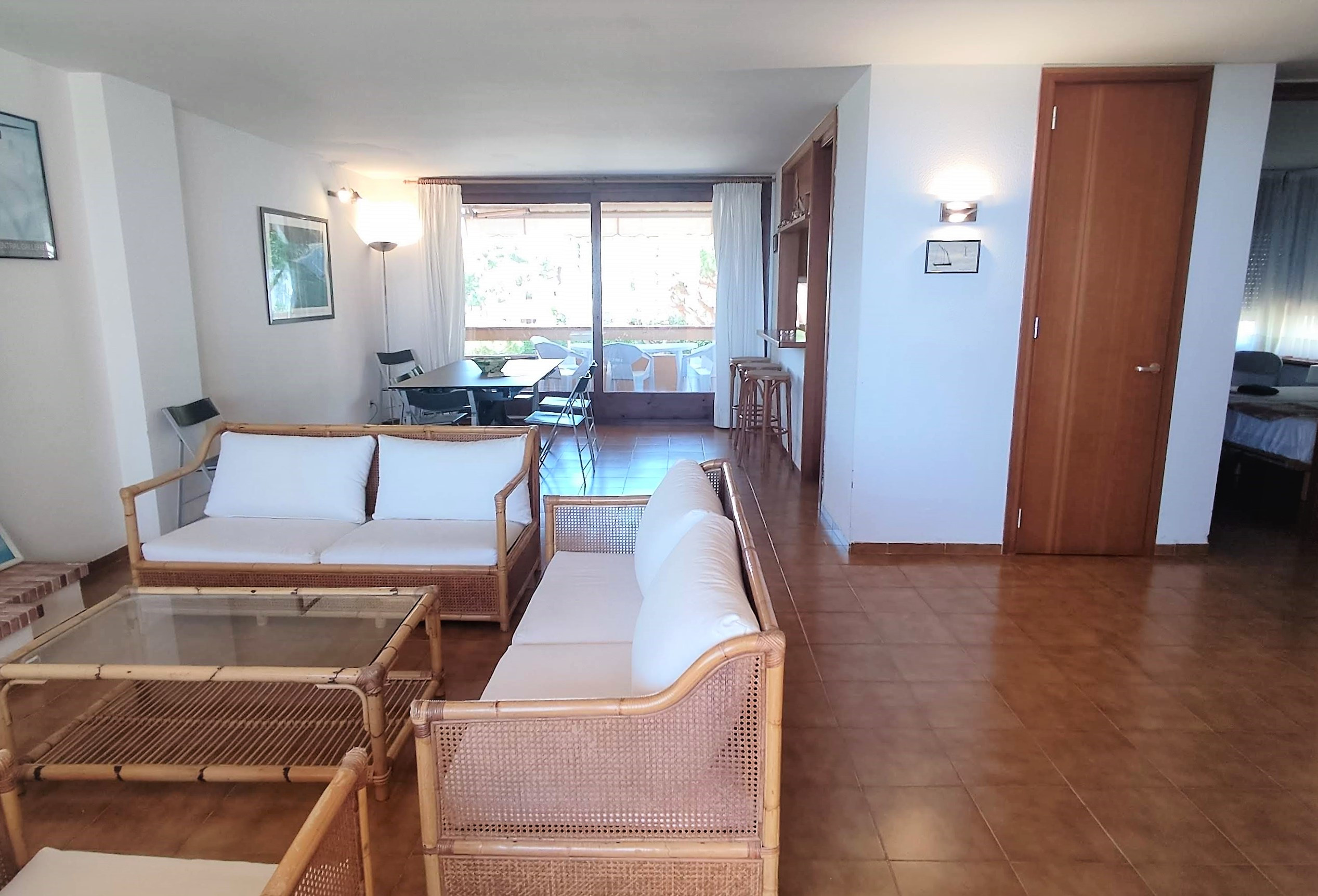 Amplio y luminoso espacio con sofá, televisión y acceso directo a la terraza con vistas al mar.