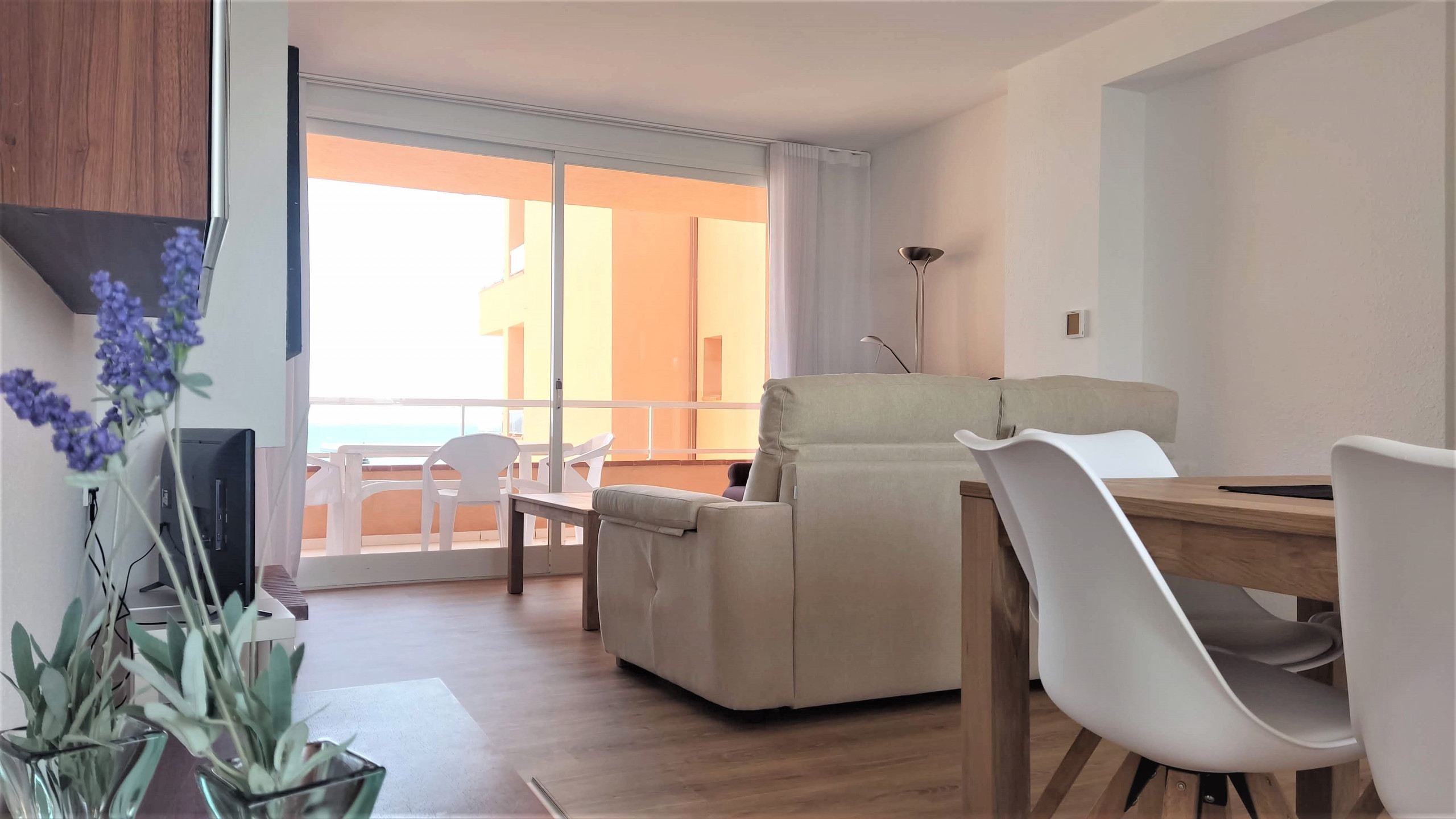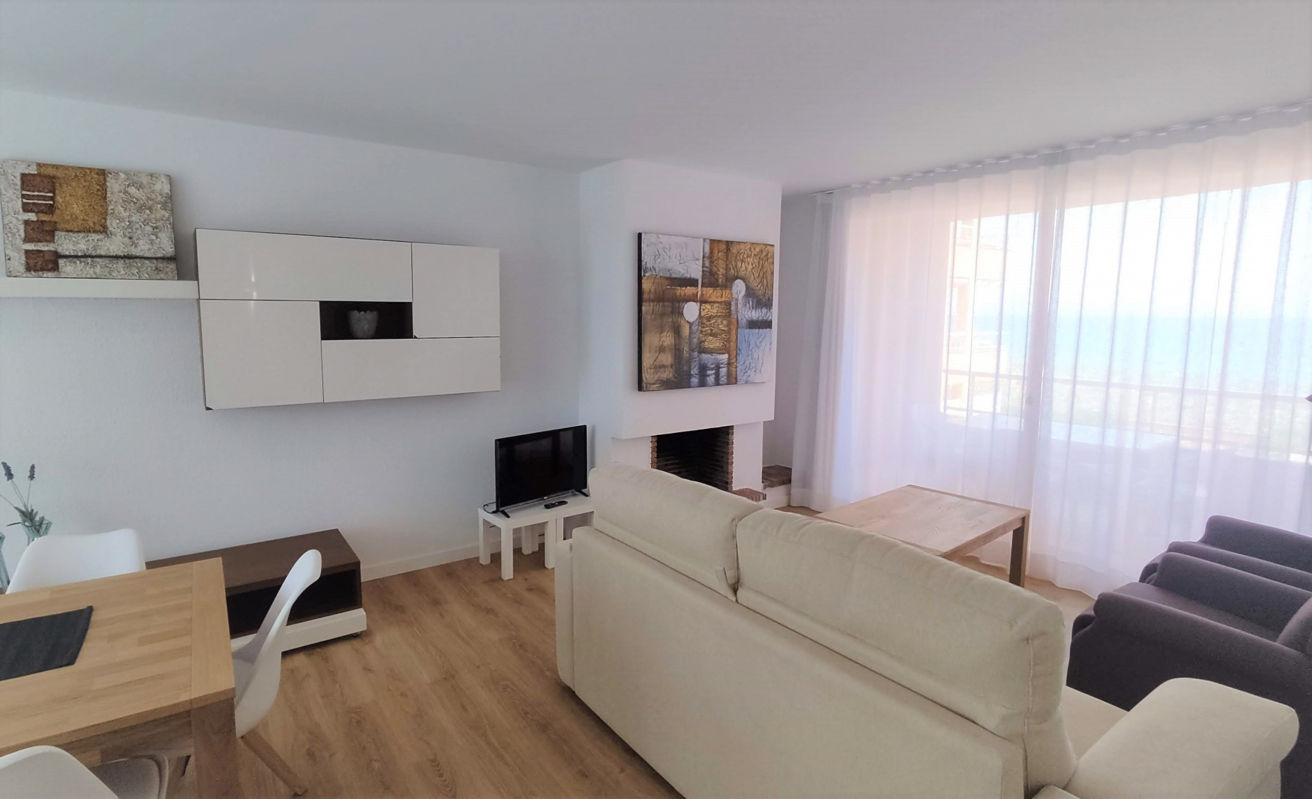 Espacio amplio y acogedor con sofá, televisión y acceso directo a la terraza con vistas espectaculares al mar.