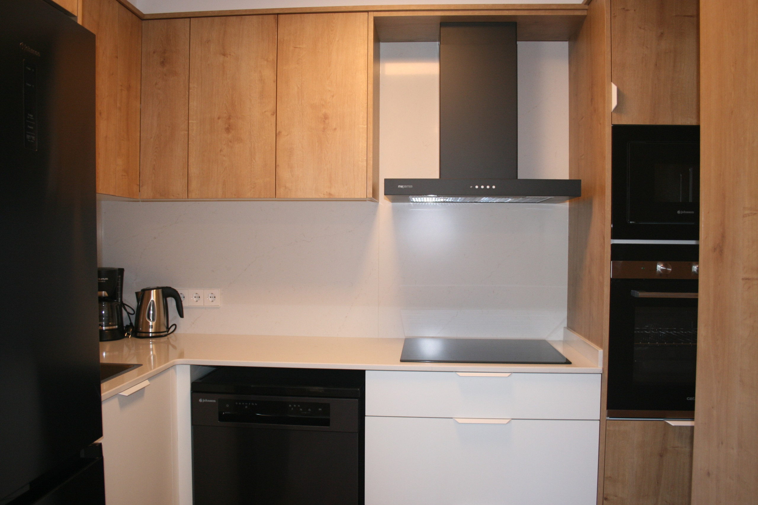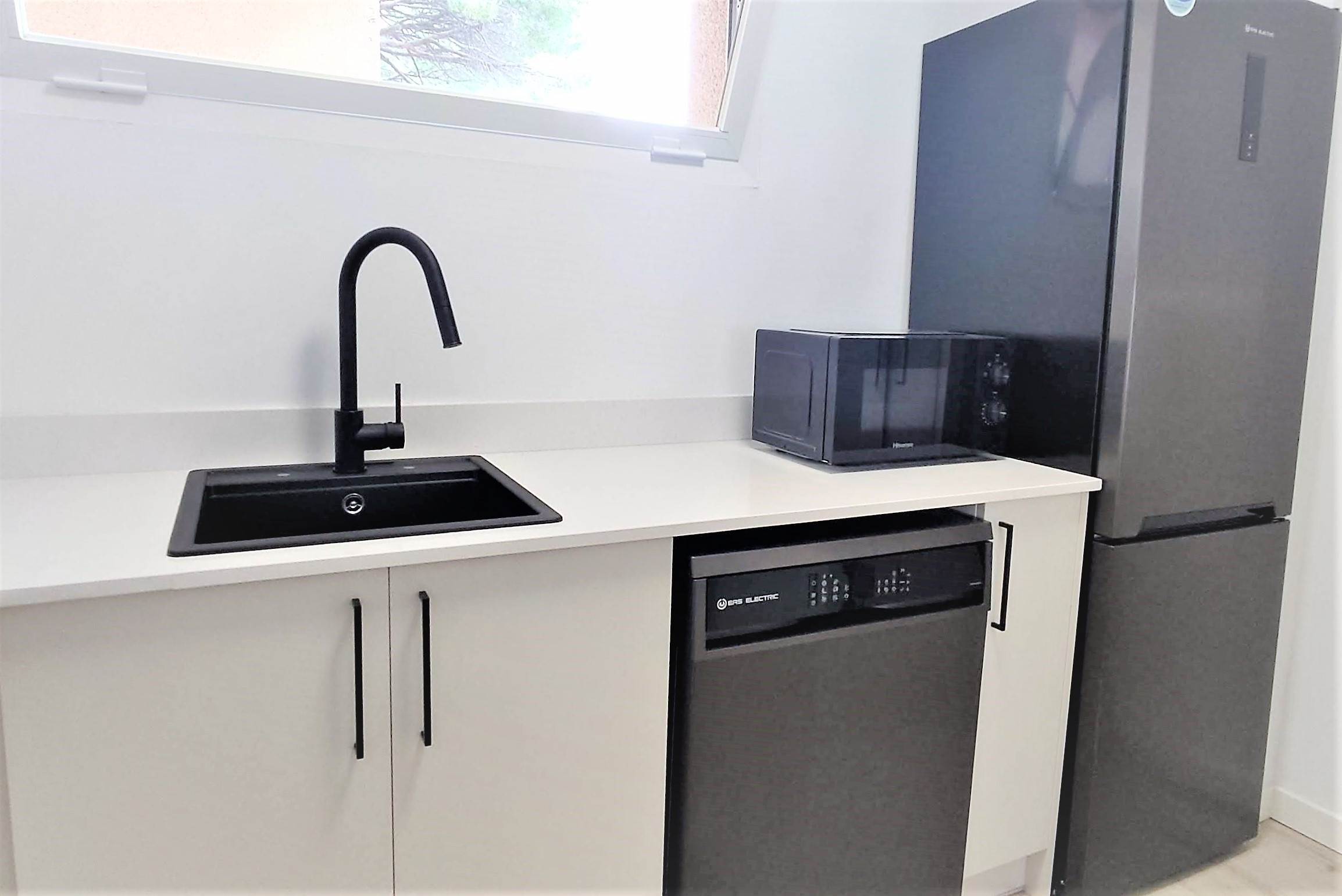 - Cocina equipada: Cocina americana de vitrocerámica con nevera, microondas, lavadora, vajilla, cubertería, utensilios de cocina, cafetera y tostadora. Los apartamentos para 4/5 personas también tienen horno.
