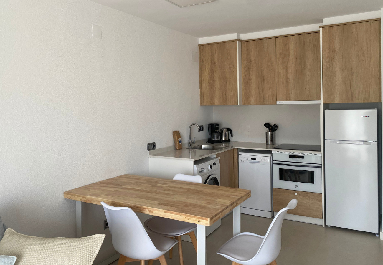 - Espacio abierto que combina cocina-comedor y una cama de matrimonio en un mismo ambiente, ideal para parejas.