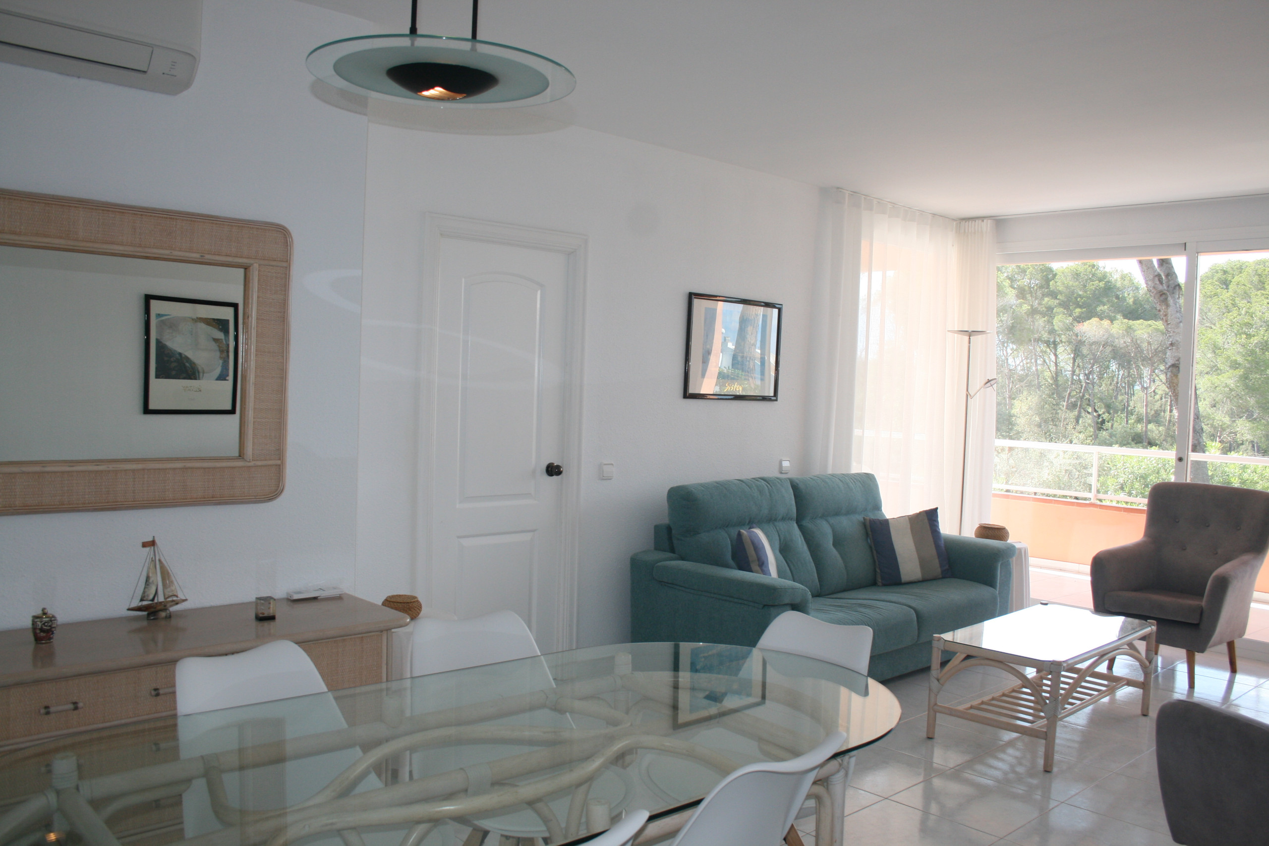 - Sala d’estar: Espai ampli i acollidor amb sofà, televisió i accés directe a la terrassa.