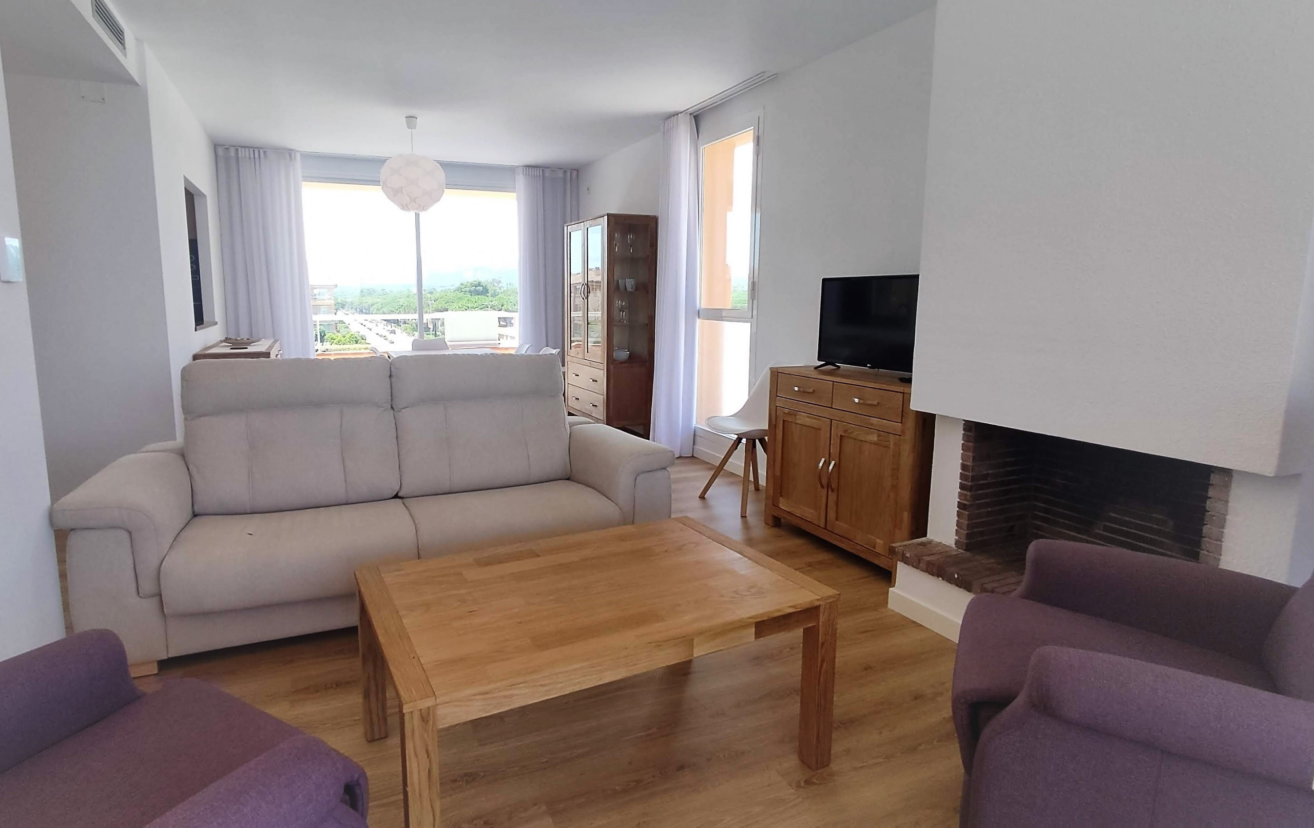 Espai ampli i acollidor amb sofàs, televisió i accés directe a la terrassa amb vistes al mar.